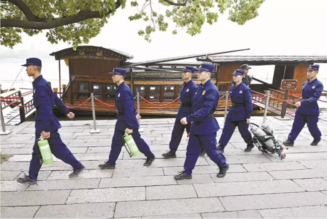 “游客多起來了,咱們堅持堅持,再巡邏一遍!”10月1日8時許,南湖景區(qū)湖心島,該支隊特勤一中隊的6名消防員在排長曹旭東的帶領下,拖著“細水霧”、提著滅火器,在大名鼎鼎的中共一大紀念船“紅船”旁與游客擦肩而過。